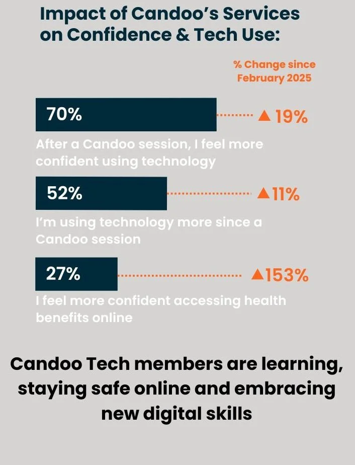 70% of Candoo clients felt more confident after a Candoo Tech session, that’s a 19% increase since February, 2025. 27% felt more confident specifically accessing healthcare benefits online. While that number is still relatively low, it’s a 153% increase in the last six months.
